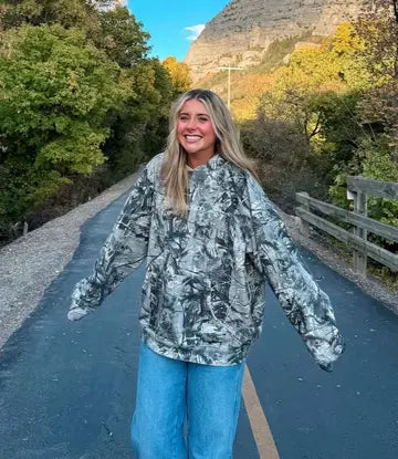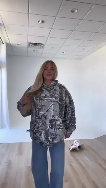 The hoodie features an oversized unisex fit. We recommend sizing down for a more fitted look.