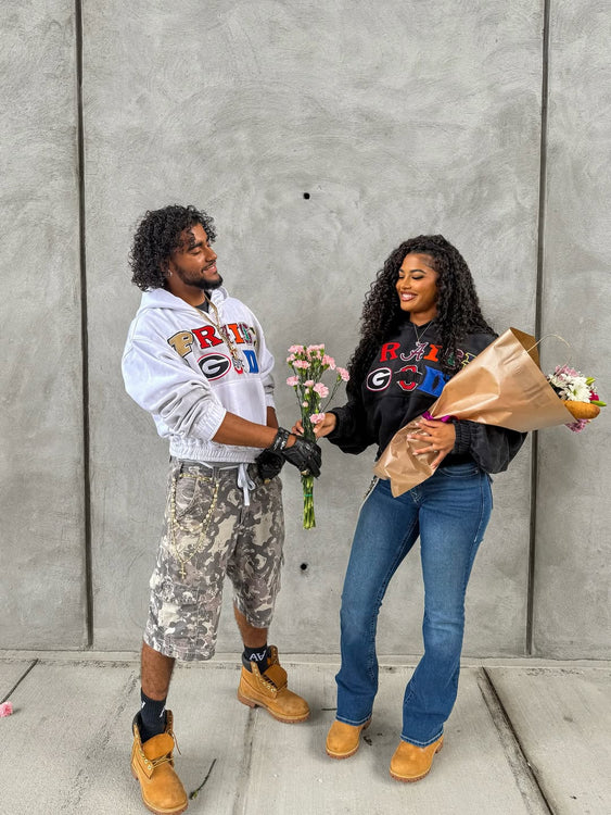 The hoodie features an oversized unisex fit. We recommend sizing down for a more fitted look.
